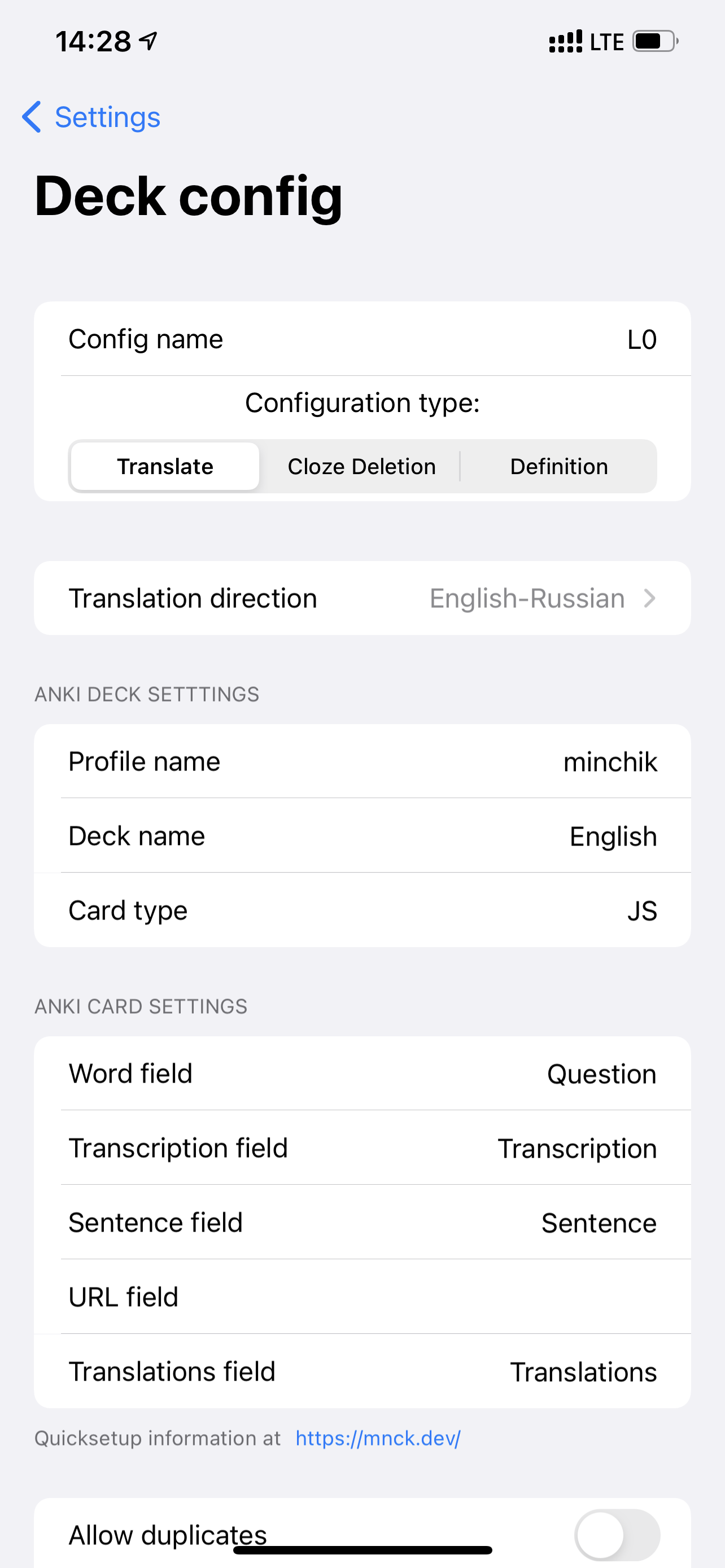 Here is the example of Anki Auto Cards configuration for basic Anki configuration with interface in English.