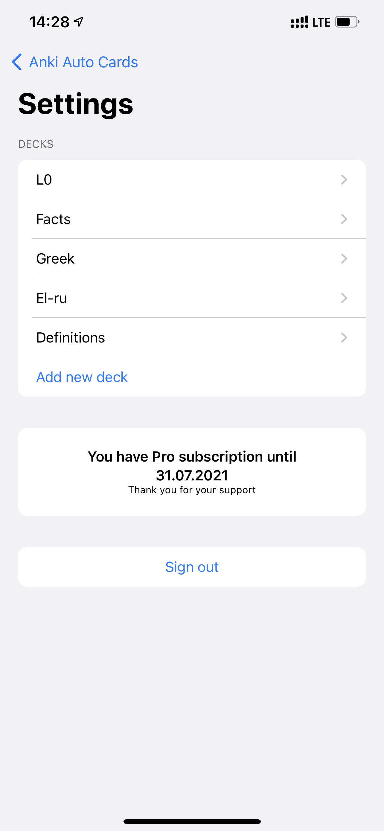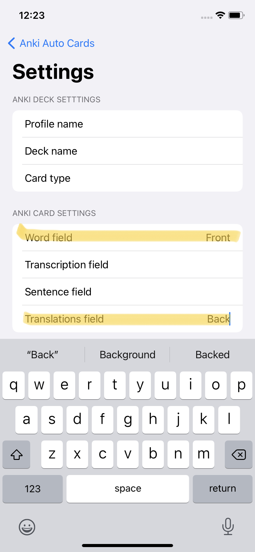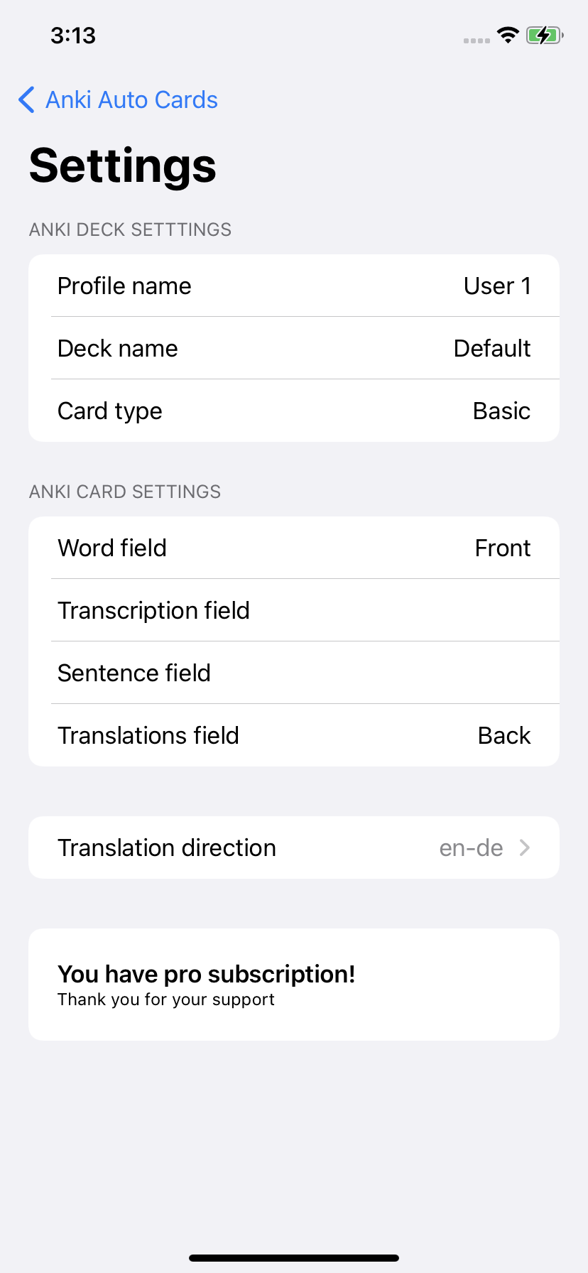 Anki Auto Cards is a companion app for Anki. It is a card generator that helps to add new cards to Anki as simply as possible. To work correctly, you should install Anki on the same device. Anki Auto Cards should be configured on the first start. Do not change any settings in Anki, please. All you need to do is copy these settings to Anki Auto Cards. You should not translate your settings from Anki when configuring Anki Auto Cards; use the same language. If your interface is in German, use German words to configure Anki Auto Cards. Please read the page below for proper setup.