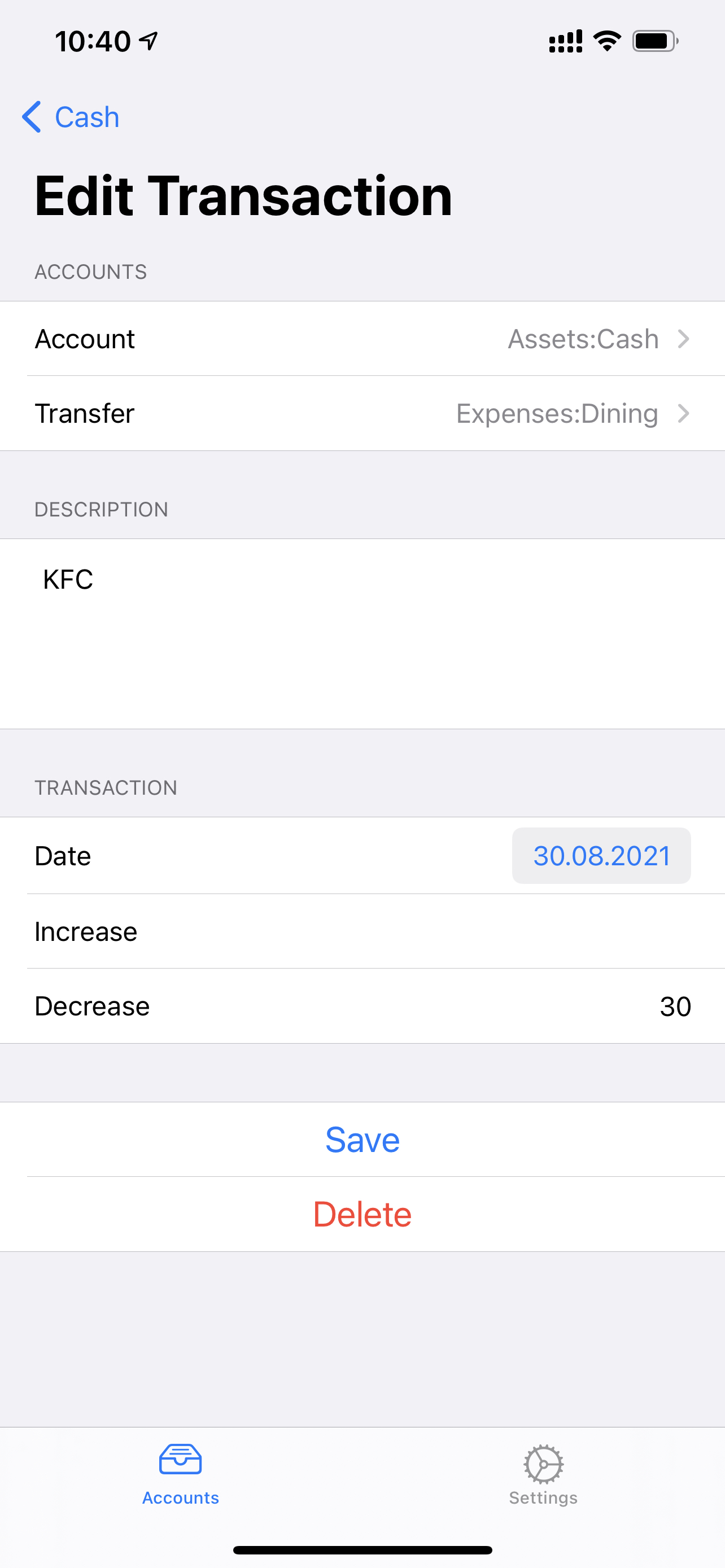 GNU Cash is my perfect app for personal finances. It has all the features I need. It is fast. Easy to use. And it is not cloud-based. But it has one serious drawback: it doesn’t have a mobile application on iOS. I know that there is an Android application that covers all the main features of the app. But I was not able to find such an application on iOS. So here is - Link to the app