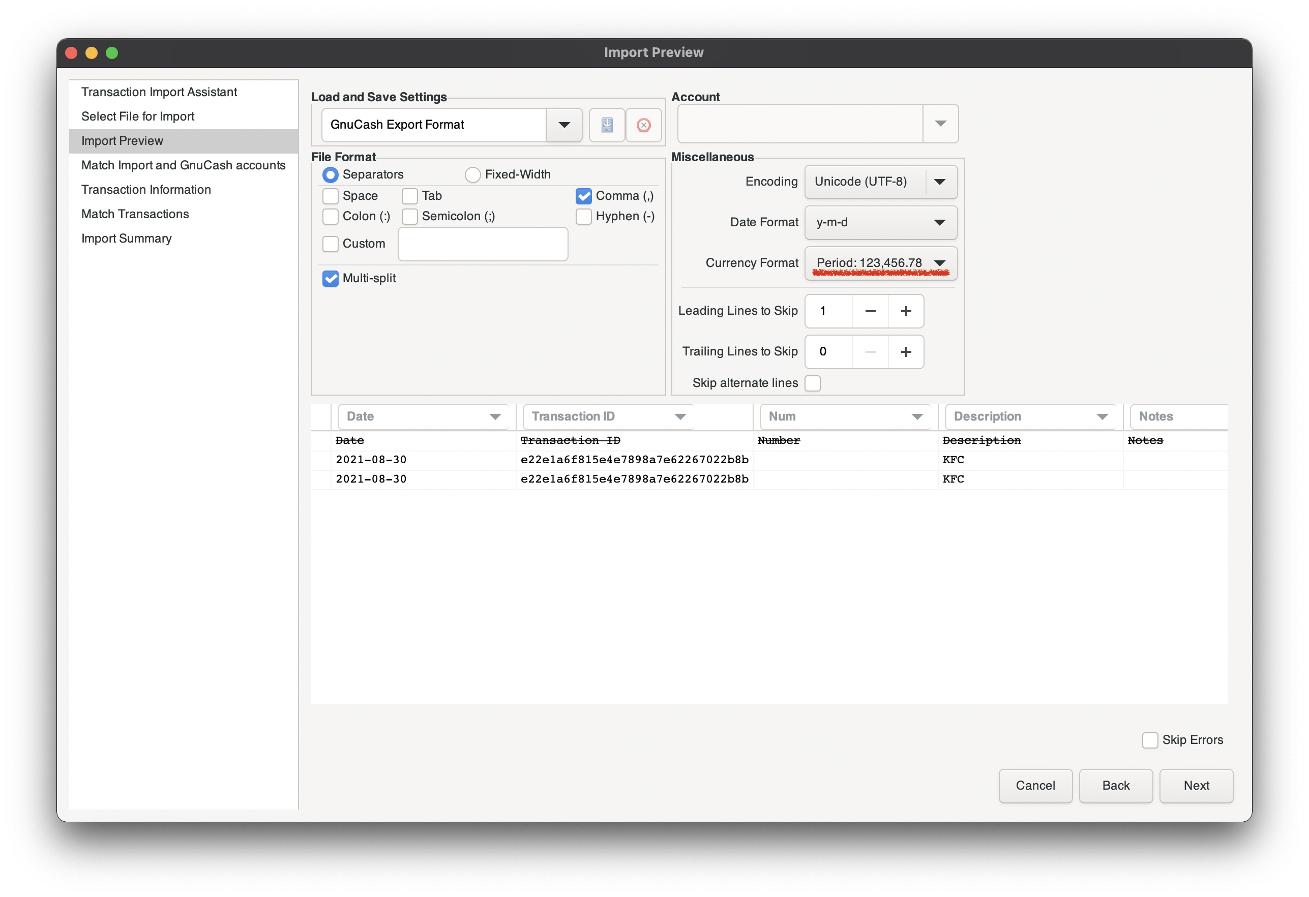As cryptomator is storing my files on the iCloud, I can see them on my MacBook in a couple of seconds after export. To import transactions to GNUCash on my Desktop, I need to open “Transaction Import Assistant.” It is available at File -> Import -> Import Transactions from CSV… Use “GnuCash Export Format” as preset, but keep in mind that GCash Mobile use “periods” as a decimal separator, so if a semicolon is used in your locale, change this option in import assistant.
