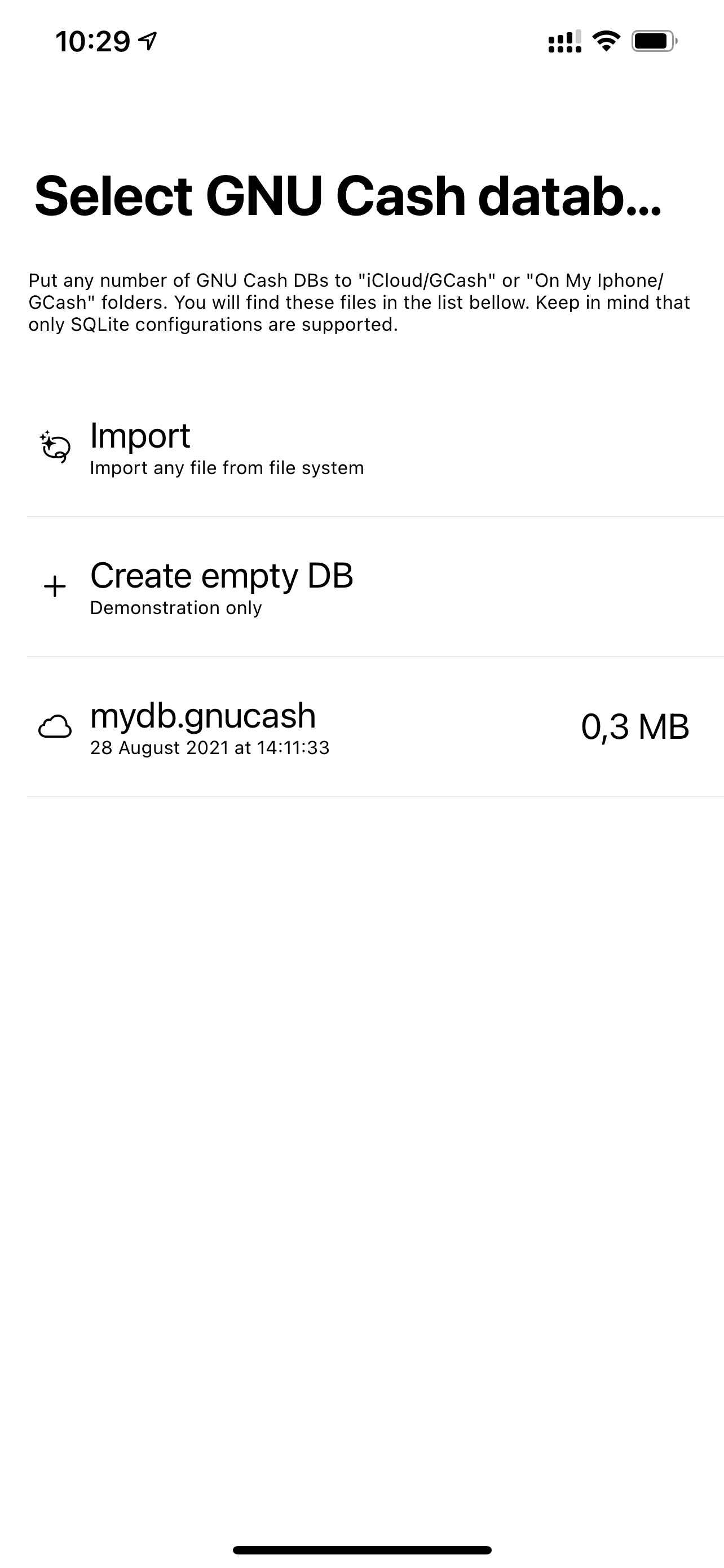 As I said, I can import GNUCash DB files from any location if the Pro version is bought. But it is still possible to open a database in the free version. The app looks for DB files in “iCloud/GCash” or “On My iPhone/GCash” folders. All the files with the *.gnucash extension will be visible on launch (make sure that synchronization is completed and your DB files are downloaded to the device).